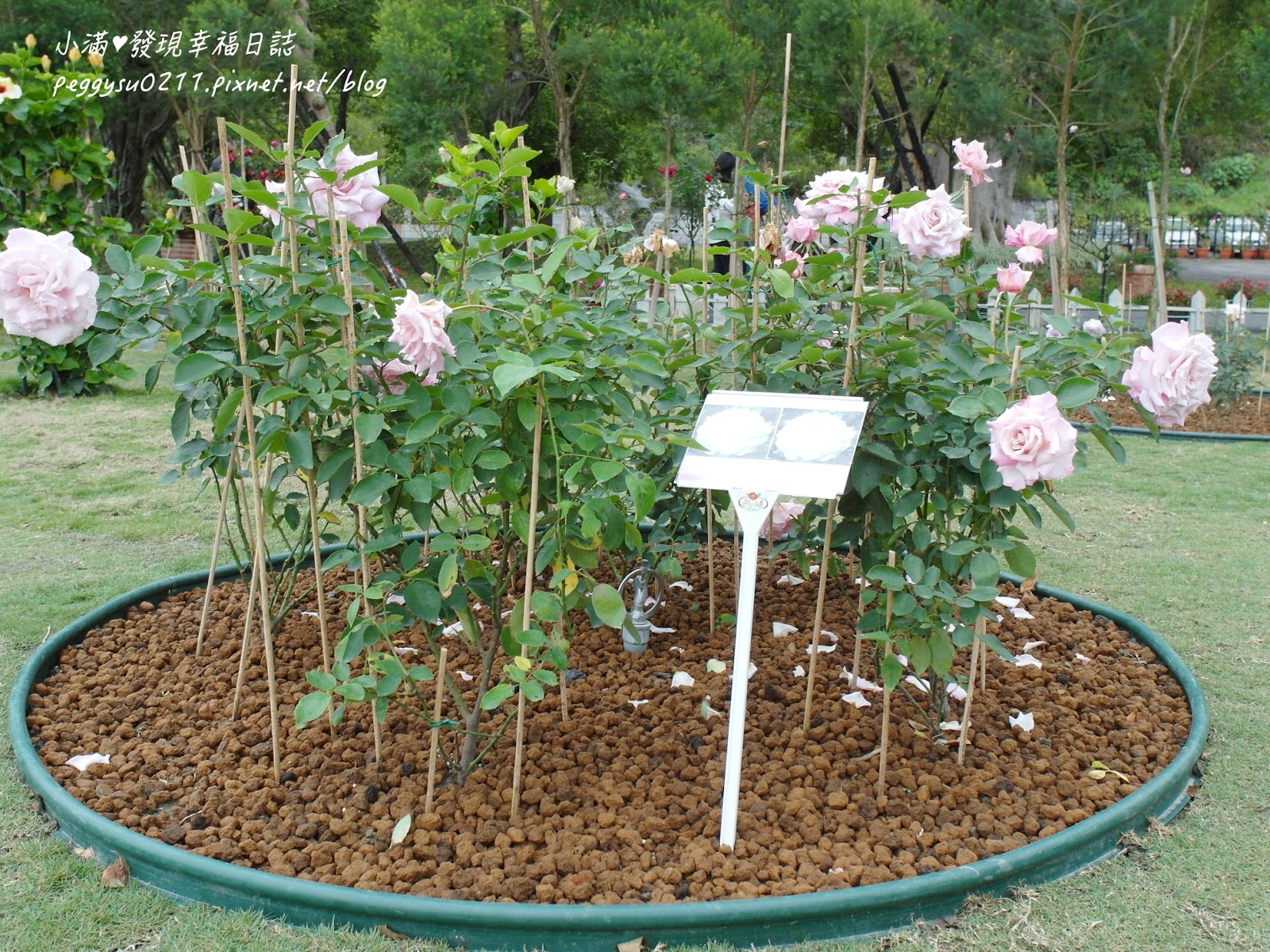 照片中的樹玫瑰有堆高的土壤提,是為了增進土壤排水