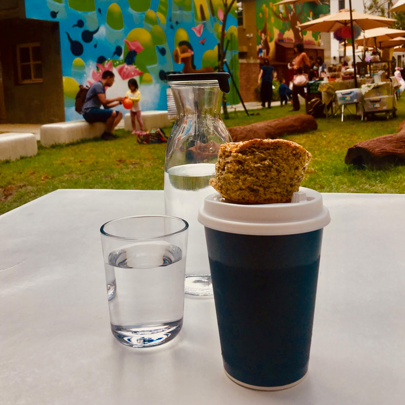 坐在戶外喝咖啡,店家很好心的給我水,我偷偷的吃起在市集買的司康,大家不要學~* 一邊曬著太陽,一邊看著草皮上的人們逛市集,度過愜意的午後。