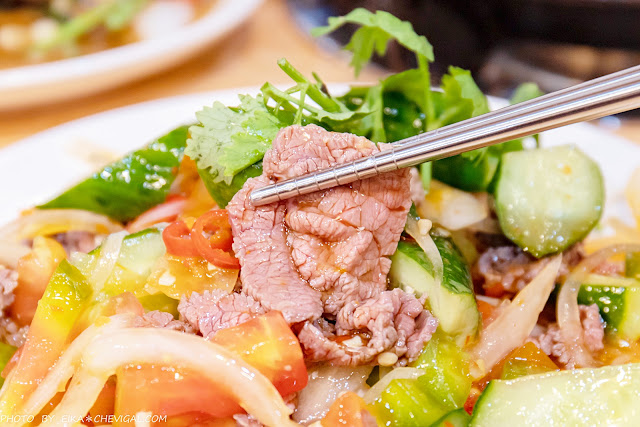 涼拌泰式牛肉$250元,我們還是第一次在溫體牛涮涮鍋餐廳內吃到如此特別的冷盤料理,裡面加入了番茄、黃瓜、洋蔥、香菜與泰式醬調味,辣椒籽也不少,吃起來相當爽辣開胃。