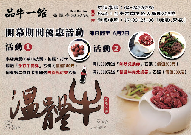 對了!品牛一館還營業至半夜十二點,作為晚餐與宵夜都很合適!另外和你們分享目前店家新開幕所推出的優惠活動,趕緊把握即日起至6/7才有的好康,揪團一起來嚐鮮吧!分享給你們~