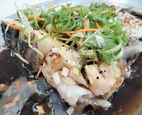 當清蒸烏鰡上桌,蔥絲和胡蘿蔔絲點綴其上,厚實的