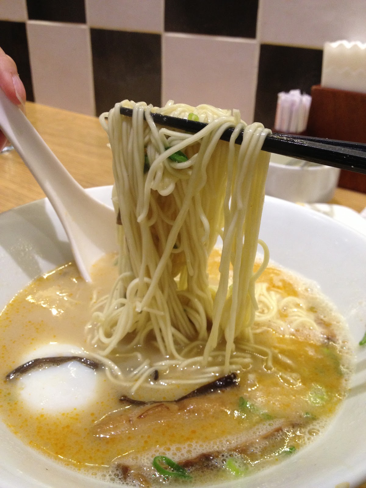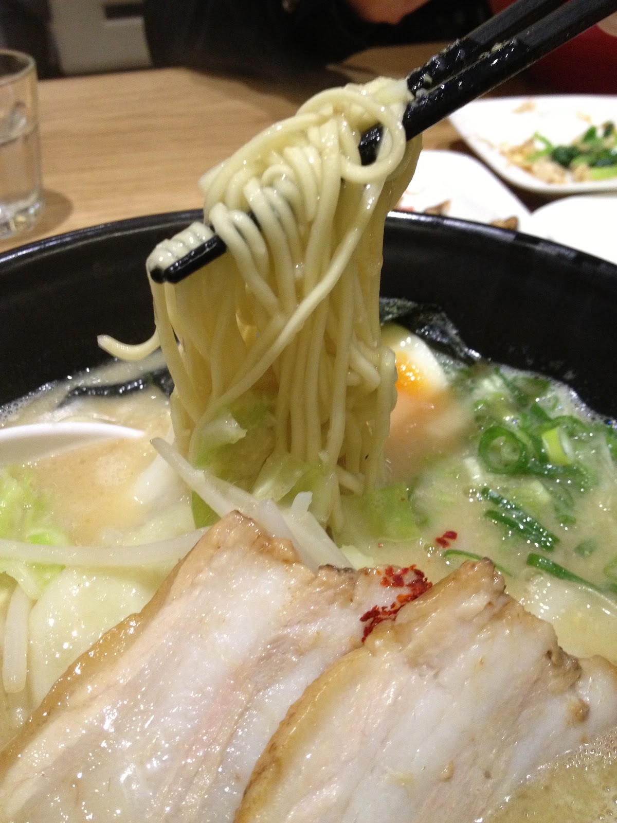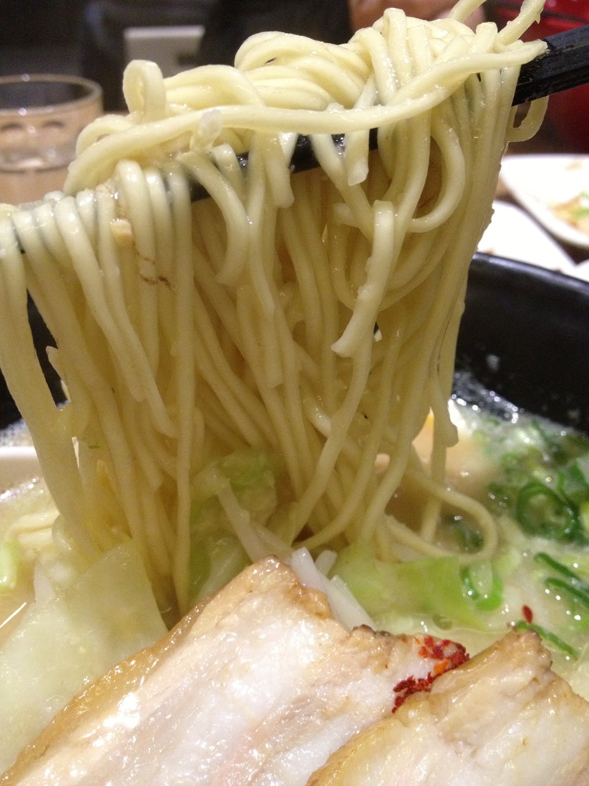 由麵條沾附湯汁的程度可以發現白丸原味的湯體是比較清爽一些些的,其實會喜歡一風堂也是因為他的麵條是屬於比較細且扎實的,麵體口感及粗細很像樂麵屋,連詢問軟硬喜好的方式都很像,莫非系出同門!