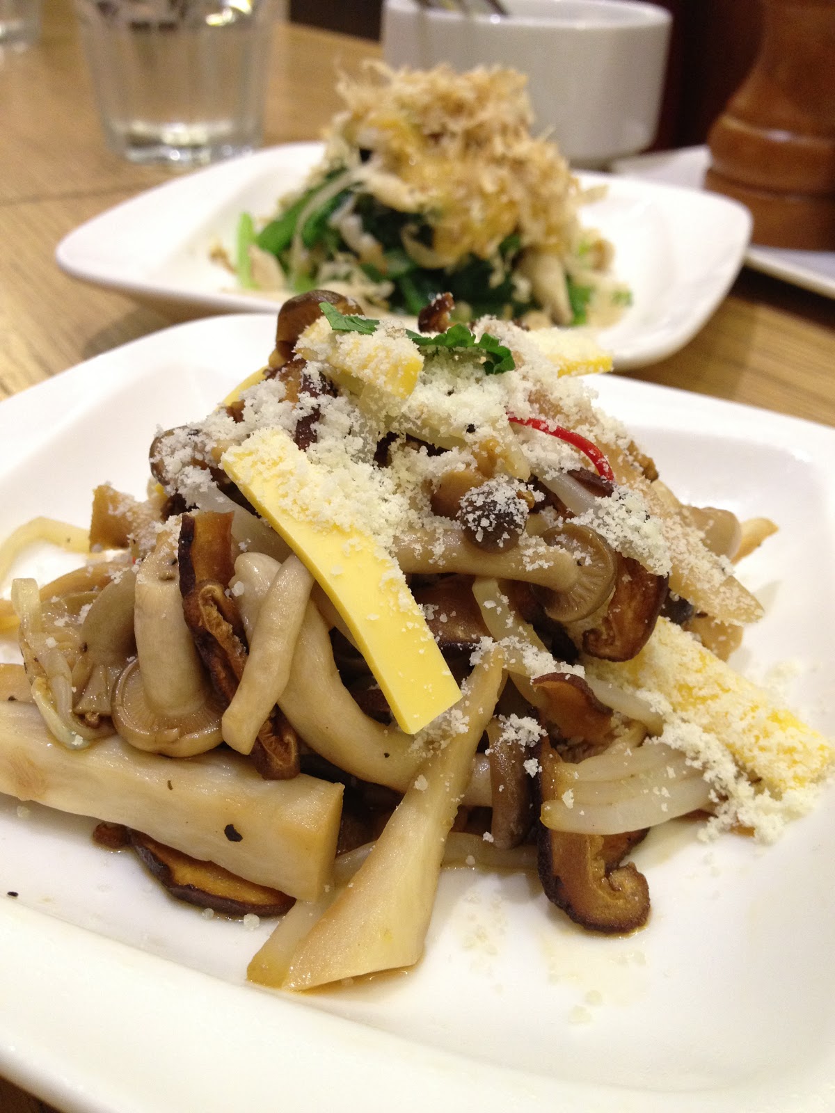 由香菇、袖珍菇、銀芽、筍片、等組合而成上面再撒以起司粉,口感豐富,時而爽脆、時而鮮嫩,在外觀與口味上都比較偏西式的一道鹹香濃的小菜 。