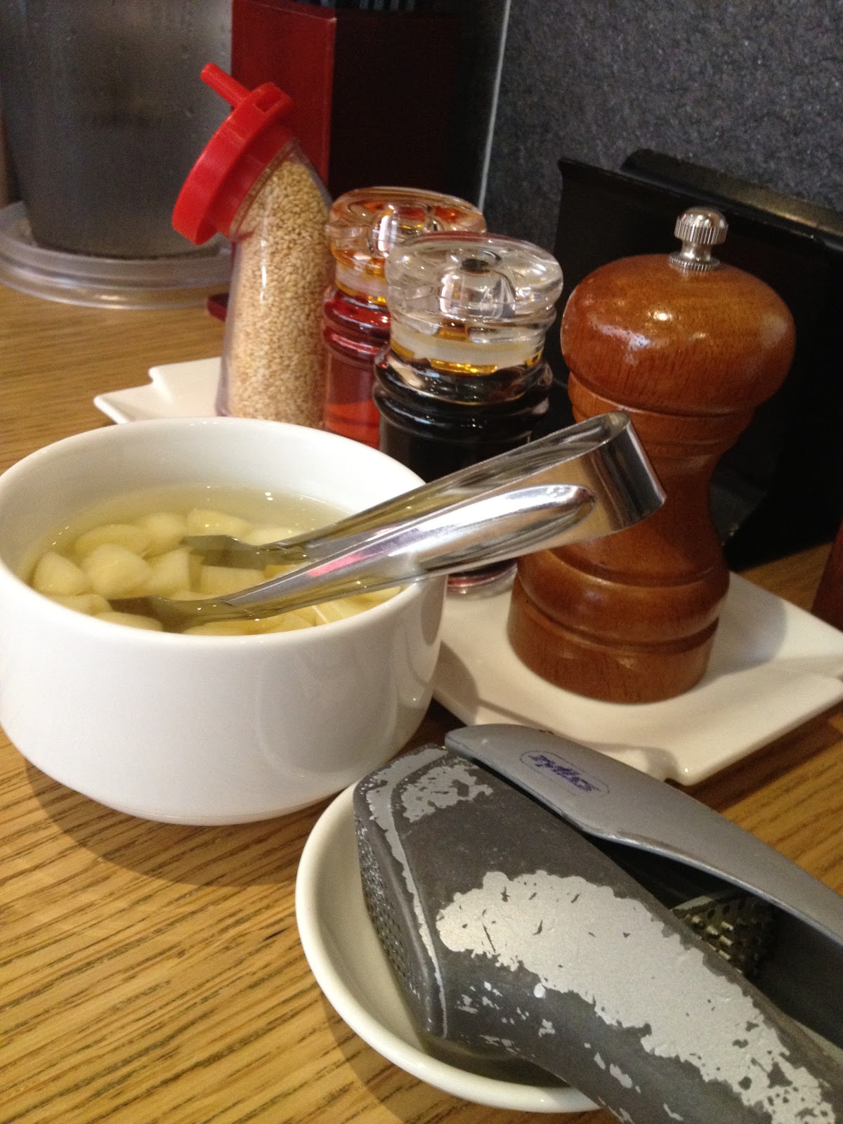 很喜歡玩弄餐廳裡的桌邊配件,貼心的把蒜頭直接擺在桌面上任君使用,顯示店家的大方。