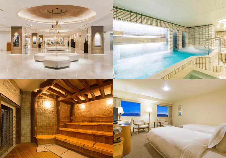 飯店的客房有日式、西式、和洋室,以及榻榻米大通舖。日式客房都是榻榻米地板,瀰漫著榻榻米的氣味,喜不喜歡就因人而異囉!景觀的部分,只有和洋室和部分日式客房有湖景,訂房時需注意一下。早晚餐都是自助式的,供應約50種日式、西式料理,晚餐菜色大多以日式為主。