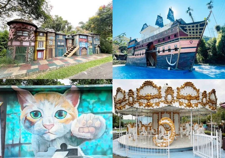 園區內設置很多南洋風格的休息亭,提供休息的地方。另外也有許多有趣生動的立體彩繪、童話風格的小鎮區,在盡情玩樂後,能夠開心合照當作深刻的回憶,是全家大小放電的好去處。