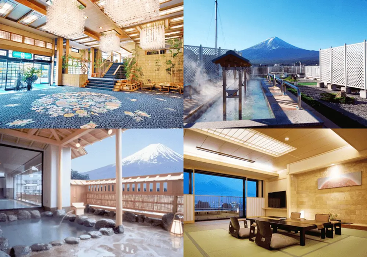 房間分為「湖景房」跟「山景房」,可以依照自己的喜好選擇入住。飯店有附設的公共室內及室外的溫泉,竹製風格的戶外溫泉正對富士山,而室內空間則設有大片的玻璃落地窗可以觀看山景,兩種都能邊泡溫泉邊享受美麗的風景,選擇湖景房的人也可以至溫泉設施欣賞山景,不會因為房間面相限制而留下遺憾。訂房時還可以選擇附設私人溫泉的套房,就連在房內的私人露天溫泉也都可以欣賞到富士山景。另外飯店的頂樓有露天的足浴可以免費使用,天氣好時可以在屋頂享受美好的足湯邊享受遼闊的風景,是一間雖然位於富士山腳但視野極佳的飯店。