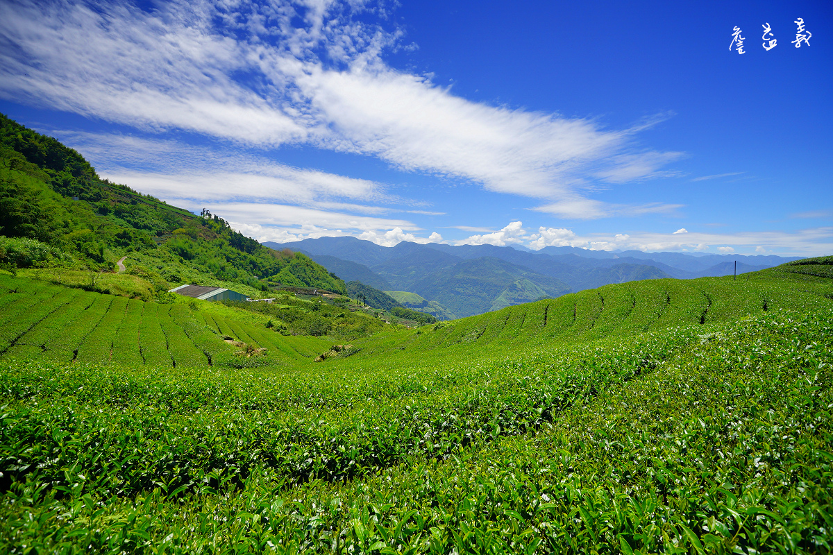 ↑二延平步道旁茶園景觀,排列整齊的形狀、巨石、藍天、白雲、山脈