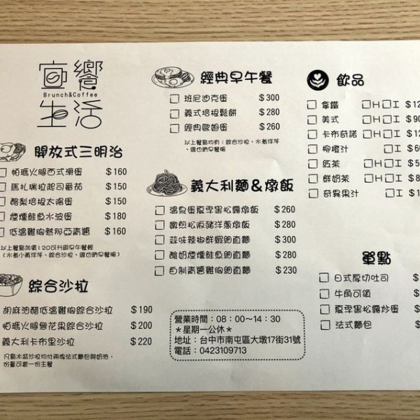 地 址台中市南屯區宜饗生活BrunchCoffee