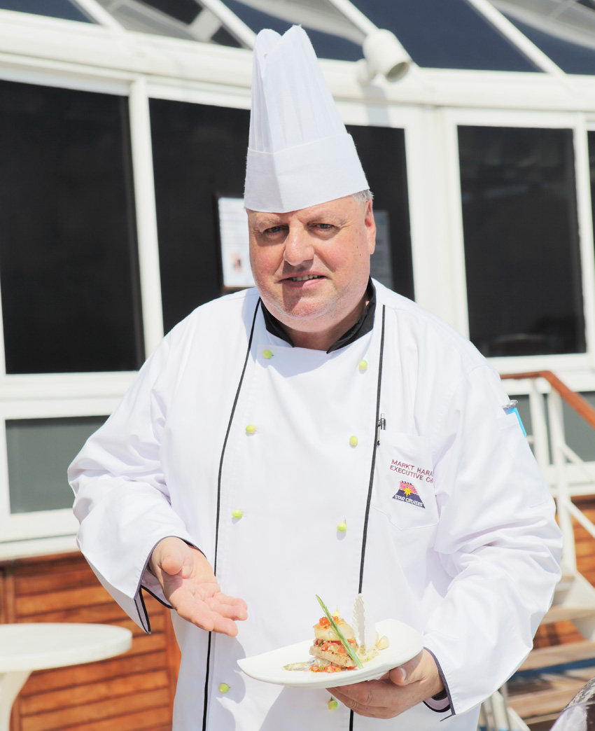 來自奧地利的主廚Harald Markt,除了擁有著歐洲傳統美食國度的薰陶,另在麗星郵輪已有十幾年以上的資歷,包含曾服務於同集團內的挪威郵輪及處女星號。而這樣的歷練,除了讓Harald的美食觀更為國際化,並且有著豐富的經驗來管理海上餐廳。諸如繁複的大宗食材購買、品質要求與備料控制、多國口味的開發與監督,更對於船上餐廳的管理有著異常的嚴謹。因為安全與衛生是海上餐廳最基本也最重要的第一要素。
