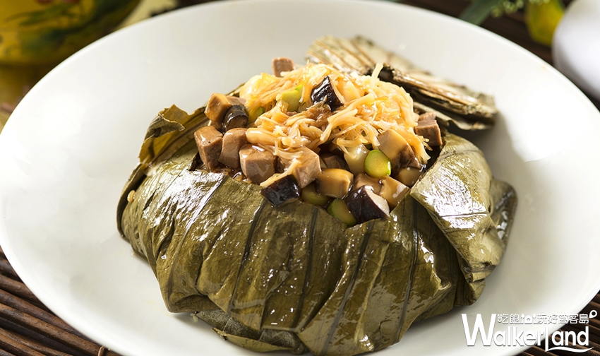 在廣東料理之中「荷葉飯」是屬於每一位饕客對於主廚功力評鑑的料理菜色之一。陳主廚推出「鮮蝦荷葉飯」選用帶有特別香氣的泰國米為主角,豪邁地加入鮮味十足的鮑魚汁、大量草蝦、燒鴨粒與乾干貝炒香後包覆於荷葉中炊蒸,完美營造粒粒分明的豪華口感。