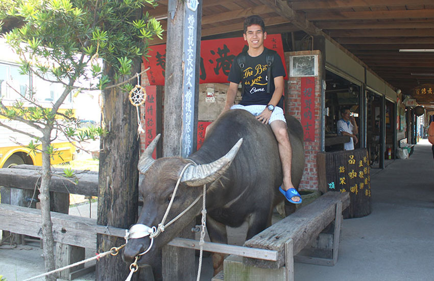 ▲來自吉爾吉斯的交換學生對第一次騎乘水牛表示相當新奇