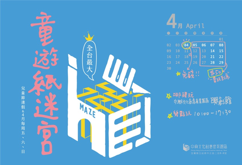 4月4日兒童節當天紙迷宮將免費開放試玩,4月5日起收費,開放時間除了兒童節連假4日到8日,還有4月的周五至周日,從早上10時開放到下午5時30分,活動地點在中興文創園區興創館。