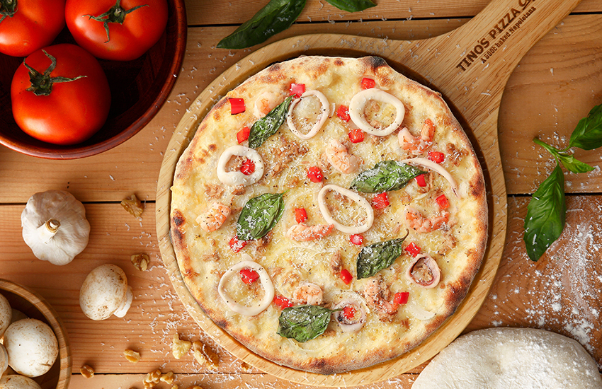 Tino’s Pizza堤諾義大利比薩,主打義大利正宗手拍比薩作法,高溫烘烤為一大特色,微微焦香及口感 Q 彈的餅皮,是堤諾比薩好吃的秘訣,羅勒起司鮮蝦、蒜香海島、松阪豬佐香橙等,都是店內顧客喜歡的熱門口味。