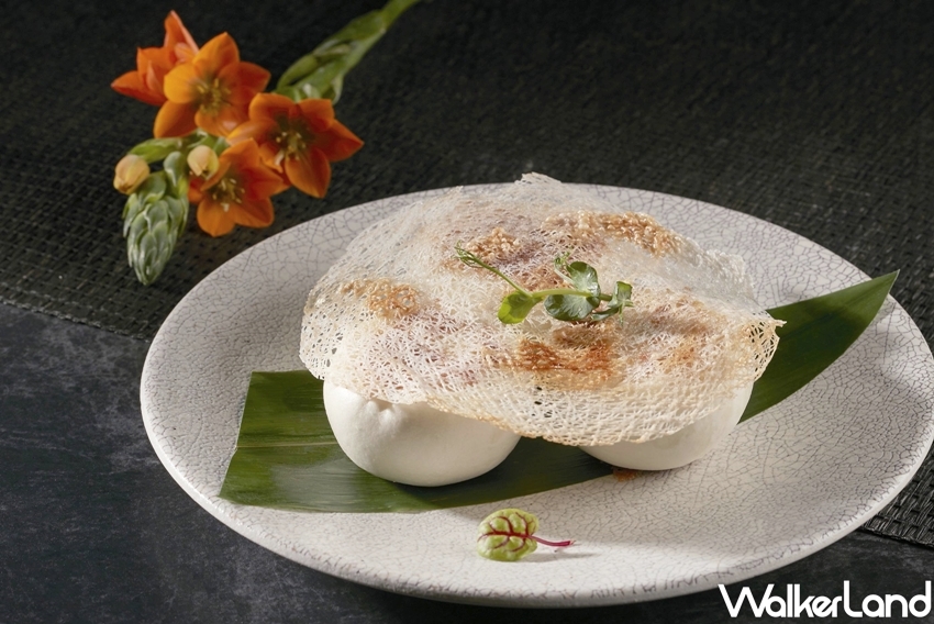 「瑤柱蘿蔔絲酥餅」薄脆的酥皮清爽不膩、蘿蔔絲白透軟綿入口即化,參夾著柔韌的北海道干貝瑤柱絲,清甜滋潤,精心設計的白蘿蔔造型,討喜吸睛。「梅干扣肉窩貼包」則是巧妙地將經典粵菜「梅干扣肉」與滬杭小品「生煎包」作結合,煎出網花的酥脆外皮,油亮香脆,包子麵皮吸附湯汁,腴潤的油脂、軟嫩的三層肉與鹹中帶甜的梅干菜,創意翻玩好滋味。