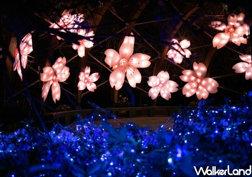 到了傍晚前往「湖山光影節」先搶拍超巨大的粉白色櫻花,等到晚上18點夜幕降臨之後,巨型櫻花牆準時點燈變成超浪漫夜櫻,前方樹叢中還用藍色燈串營造星空的氛圍,最建議的拍法就是稍微放低姿勢,以星空樹叢為前景,夜櫻為背景,就能拍出最不一樣的櫻花美照。