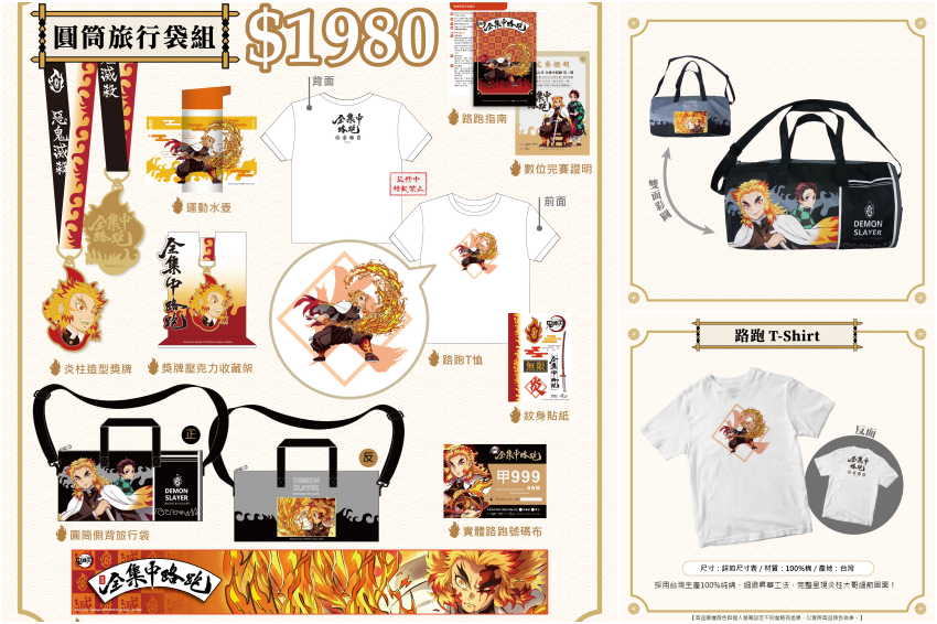 2020年舉辦的第一彈「鬼滅之刃全集中路跑」,北中南三場合計吸引近2萬名鬼滅迷熱情參與,延續《鬼滅之刃劇場版 無限列車篇》的超高票房,夾帶《鬼滅之刃遊郭篇》動畫近日開播的高人氣,鬼滅之刃全集中路跑第二彈在2022年春天將再次與粉絲們見面了!這次特別以大家最喜愛的「炎柱」為主題,設計三種組合的大哥專屬路跑物資包,大哥鐵粉們千萬不能錯過。死忠粉絲必收的「圓筒旅行袋組」(1,980元)一口氣將限定路跑物資帶回家,報名線上路跑更加贈精緻設計的鬼滅之刃襪子喔~