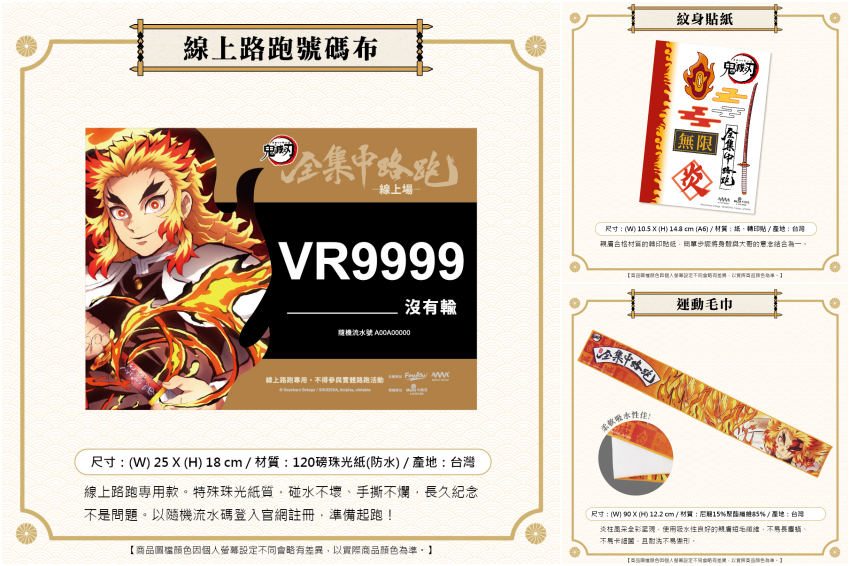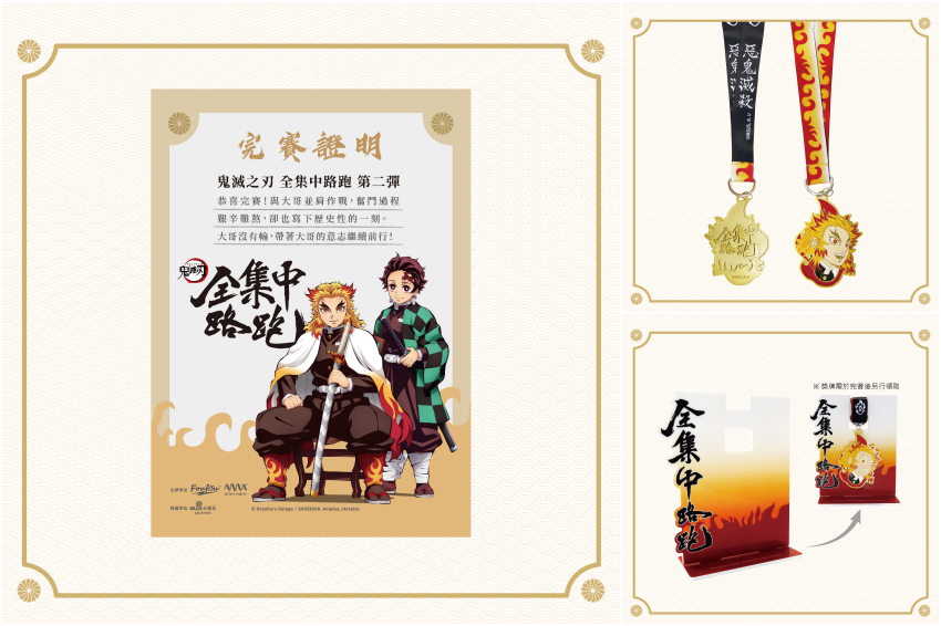 ▲完賽的粉絲們可以獲得「尊榮版炎柱完賽獎牌」(右上)及數位完賽證明(左),選擇「運動水壺組」和「圓筒旅行袋組」的粉絲們更可將獎牌掛上「獎牌收藏壓克力架」(右下)。跑者獨家限定加購商品!炎柱刀鍔老帽、襪子打造完美日常穿搭