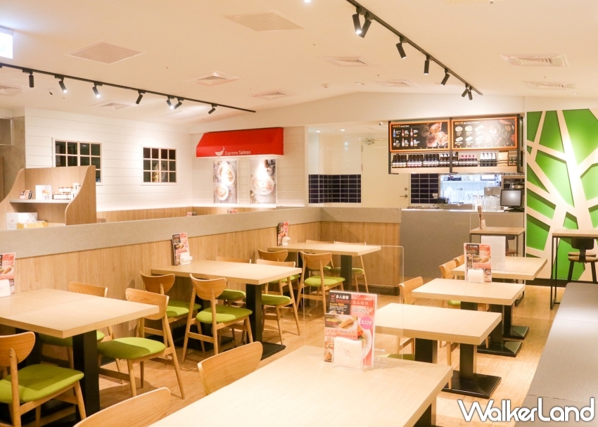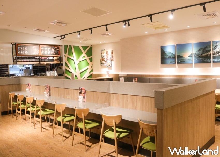 同時,美威鮭魚遵循北歐品牌特性,以白灰色與原木色為主色系,創造自然質感的空間基底,輔以鮮明色彩點綴餐椅、牆面,活潑店面表情,再透過暖光情境照明、木質三角造型吊燈襯出小木屋的美學效果,以挪威峽灣掛畫入景,宛若在都市中另闢一方優美海景,創造值得在此慢食交流的空間、讓消費者每一口都嚐到來自大海的鮮味。