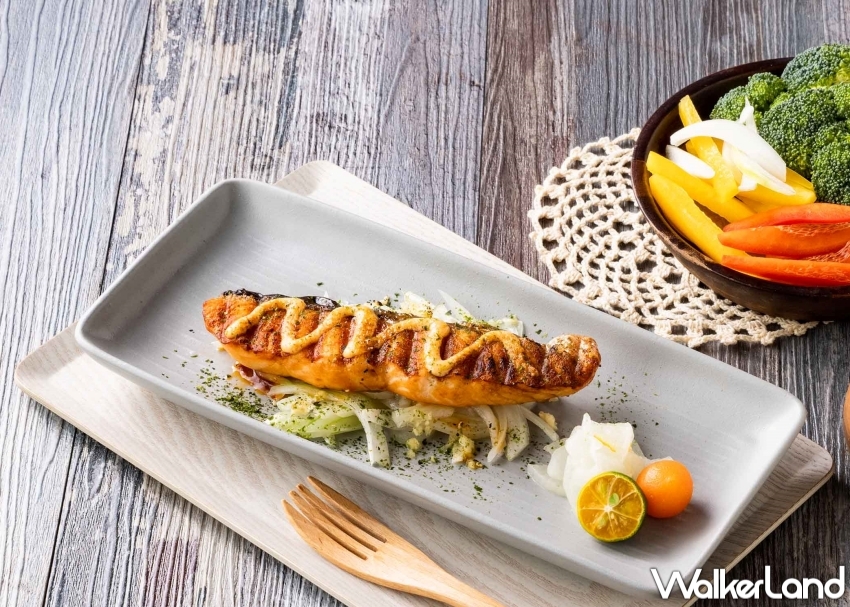 「嫩烤鮭魚白花椰菜米」(定價318元)、「炭烤彩蔬厚切鮭魚」(定價328元)指定主餐5折(中午、晚上各50份,每日共限量100份)