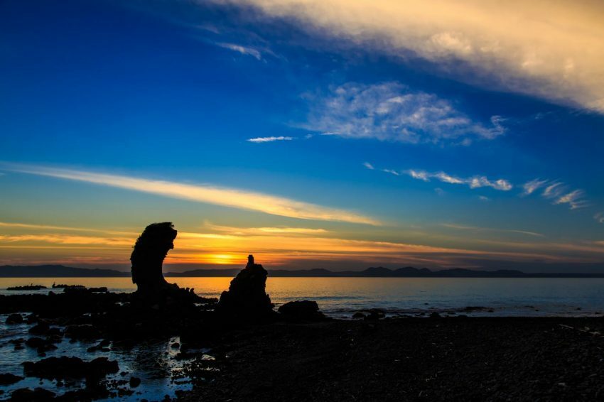 佇立在海邊的兩子岩是約150萬年前,火山噴發的土石流沉積,經過海浪侵蝕後所形成的兩座岩石,造型看似人頭,因而得名。其中一座因地震崩塌,目前僅剩一座。據說黃昏時的剪影與復活節島的摩艾石像相似,所以這般風景又被暱稱為「摩艾的黃昏」。