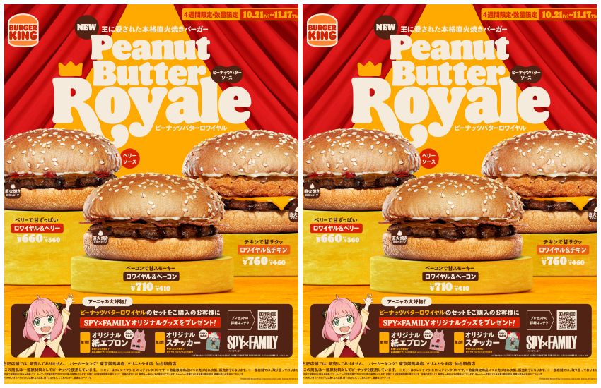 至於餐點的部分,日本全國漢堡王門市也為了安妮亞特別推出了3款「花生醬系列漢堡」(Peanut Butter Royale),讓喜歡安妮亞的粉絲可以隨時和她一起「哇苦哇苦」大吃漢堡!這3款漢堡皆以花生醬為主角,再分別搭配「牛肉+莓果醬」、「培根」、「雞肉」,如果一口氣購買3個花生醬系列的漢堡,還可以拿到限量的「安妮亞紙製圍裙」或「安妮亞貼紙」,這段期間在日本遊玩的粉絲們,別錯過近距離接近安妮亞的機會唷。