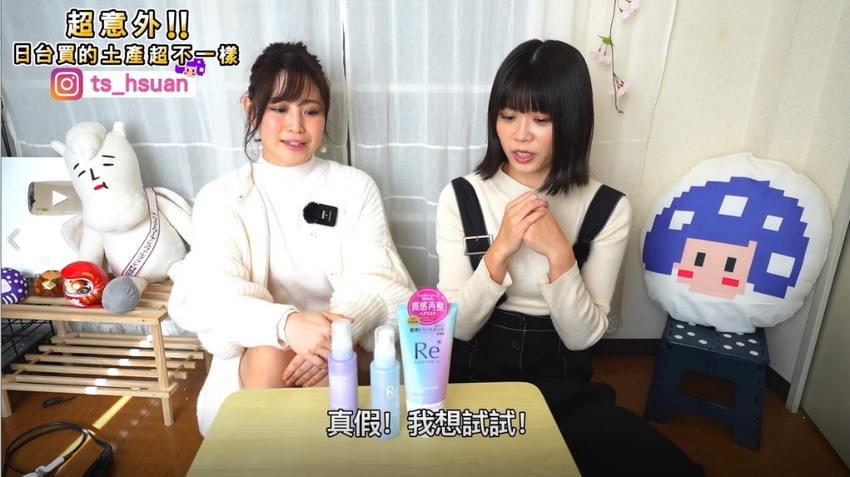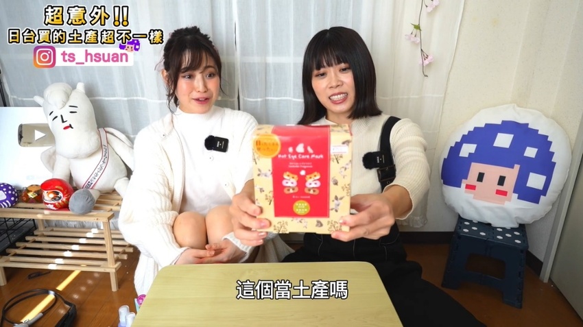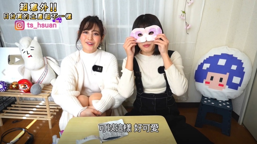 一樣也讓Marina吃驚:「這個當土產嗎?」,萱萱:「會推薦這個,特別是眼睛的地方有洞,在敷的時候還可以滑手機很實用」此外,還有三種不同的動物造型(狐狸、兔子、熊)。打開了兔子造型的眼膜(薰衣草香),帶起來也很可愛,所以萱萱很常會購買拿來當伴手禮或慰勞品。
