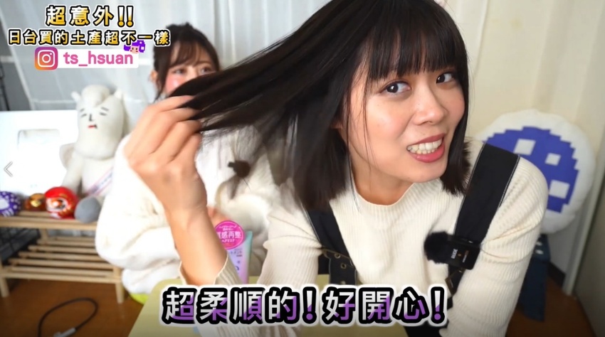 萱萱聽完後直喊想試用看看!頭髮弄濕後Marina幫忙萱萱抹上髮膜,輕輕抓柔頭髮還散發淡淡的果香味,萱萱更提到「好香喔~原來這就是日本女生的小心機」,坐等3分鐘後沖洗吹乾,再用離子夾稍微加熱就可以感受到頭髮的柔順感!效果好到讓萱萱直呼好讚喔,想要!