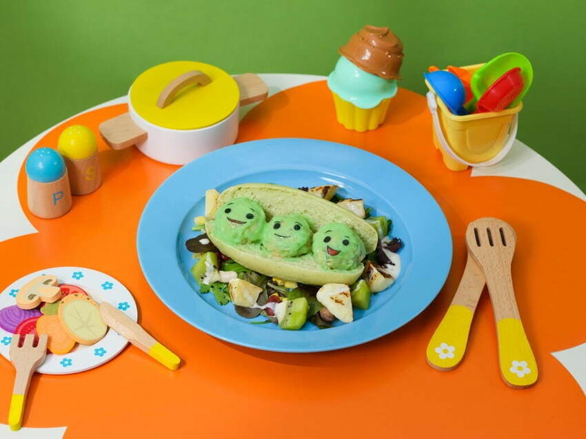 僅於前半期限定提供的「邦妮房間菜單」裡,由超吸睛的「碗豆三兄妹豆腐丸麵包」、「釘子褲先生咖哩麵包」領軍登場;後半期的限定版餐點「陽光托兒所的玩具屋菜單」,則有挑戰粉絲味蕾的「熊抱哥草莓漢堡」以及用大型奶瓶盛裝的牛奶系飲品等,口味多變加上讓人眼睛一亮的外觀,端上桌就讓人想先拍好幾張照片留念。