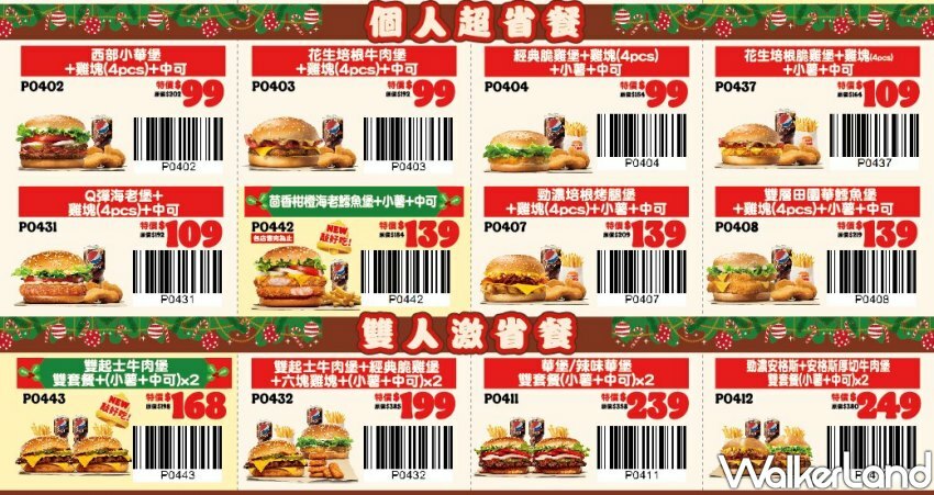 個人激省餐則是主打「99元個人套餐」,無論是小華堡還是花生培根牛肉堡,搭上四塊雞塊和中可,百元有找就能吃飽飽。而聖誕節限量「茴香柑橙海老鱈魚堡」個人套餐也只要139元,吃得到整隻蝦的蝦堡必點。另外雙人套餐先搶吃「239元華堡/辣味華堡雙套餐」,等於第2套35折超佛。