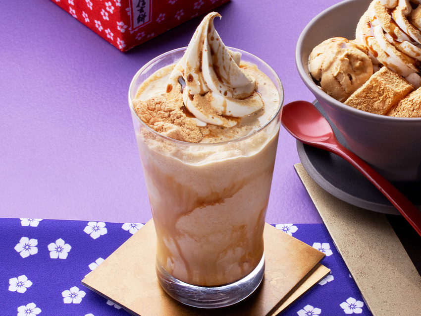 飲品的部分共有2款,分別是「黑蜜黃豆粉蕨餅奶昔」、「黑蜜黃豆粉蕨餅拿鐵」,兩者皆由沖繩黑蜜、北海道煉乳與黃豆粉製作而成,完美再現桔梗信玄餅本身濃醇的風味,一冰一熱讓大家剛好可以根據天氣或喜好,選擇喜歡的甜蜜飲品。