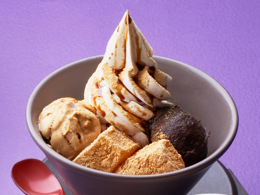 另一款重點商品「黑蜜黃豆粉蕨餅綜合聖代」則以濃厚的霜淇淋為基底,淋灑上黑蜜醬與黃豆粉,最後再以蕨餅作為點綴,就算是長輩也會很喜歡這款相當有韻味的經典日式甜點。