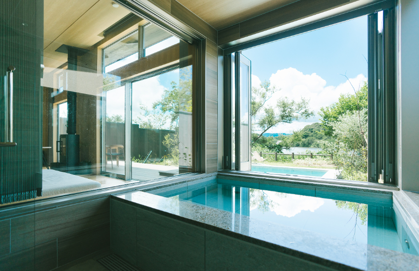 包棟別墅包含「風ユ Fuyu」、「晴ル Haru」、「菜ツ Natsu」3棟,各自有不同的主題,別墅內提供半露天浴池、花園露台,以及戶外游泳池和柴火爐,一晚含晚、早餐每人費用約45,100日圓起含稅。湖景客房配有湖景浴池和露台,一房最多可容納3人,適合小家庭出遊。 從浴池和露台可以欣賞到湖光山色。 另外,靠山側的客房能夠容納4人。價格較包棟便宜,湖景房一晚含晚、早餐每人費用37,400日圓,山景房則是35,200日圓起,含稅。