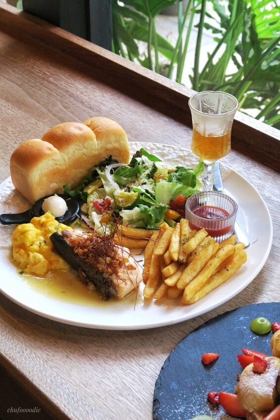 多初點早午餐的盤式早午餐,主食可選吐司/鹽可頌/飯食,吐司吃起來柔軟蓬鬆~還附有鹹鹹的AOP奶油,這個奶油非常重要!塗上吐司根本非常對味,飯食的部分會提供兩個小的烤飯糰唷,盤式皆附有沙拉跟香酥脆薯,還有很濃郁的美式起司炒蛋,蒜香奶油鮭魚吃起來蒜香味偏重,配上有類似柴魚口感的辣椒絲非常特別,紙包醬爆鮭魚吃起來少了蒜香味,會比較像是醬炒的醇鹹鮭魚肉<全文介紹>
