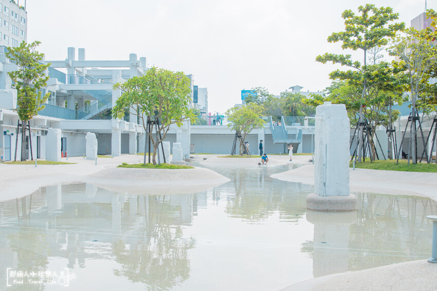 廣場中間不規則的地形起伏,剛好造就了蓄水的水池。許多年輕人很愛來這裡拍照打卡,因為這裡開放民眾玩水,而且純白色的建築,搭配蔚藍的天空拍起來,畫面很簡潔。最棒的就是橋墩的底下就是遮陽的空間,許多父母都帶著自家的小寶貝前來玩水。大人乘涼,小孩玩水,不亦樂乎~<全文介紹>