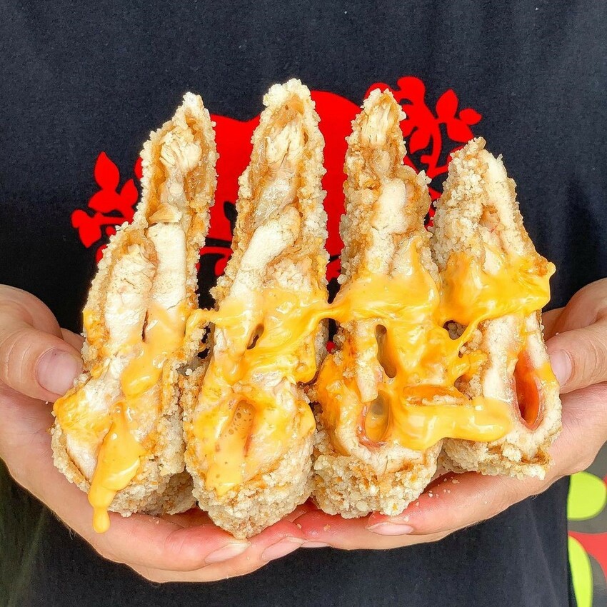 超邪惡爆漿起司雞排!虎尾爆醬雞排主要販售多種口味炸雞排、炸豬排,以及其他炸物小點等,其中熱門必點「爆醬雞排」,現炸無骨炸雞排中夾入火腿、起司內餡,一咬下便爆出滿滿的濃郁起司,爆漿口感邪惡度爆表,虎尾人最推的在地炸雞排,起司控、雞排控來虎尾必吃。