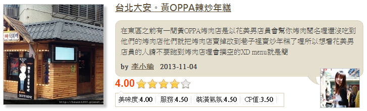 在東區之前有一間黃OPPA烤肉店,是以花美男店員會幫你烤肉聞名喔!還沒吃到他們的烤肉店他們就把烤肉店賣掉改到巷子裡賣炒年糕了喔!所以想看花美男店員的人請不要跑到烤肉店喔!會撲空的XD炒年糕鍋,他們的辣炒醬是有點甜甜的辣辣的,跟麵一起吃最好吃了。年糕熱熱暖呼呼的也好好吃,不過糯米製的東西真的是好飽,還沒吃到飯都快宣告投降了。