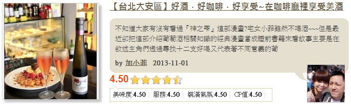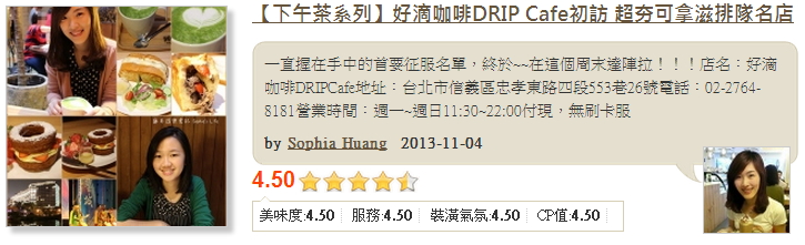 Sophia Huang:這家咖啡店可以算是2013年最熱門的下午茶店之一,他們在今年7月開始試營運。店內一貫的舒適簡約風,讓人真的有很享受周末悠閒的感覺,蘇菲和好姊妹一致覺得這裡的環境有點韓國風的感覺,喜歡他的木質牆面、座椅設計。我們坐在比較裡面的庭園式假露天咖啡座位區,非常寬敞、不受打擾的空間,比起外面的座位人很多也比較擁擠,還要看店外很多排隊人潮的目光真是有些壓力。蘇菲覺得這次有提早訂位、又很幸運的被安排在超棒的座位,真的是完全愛上了它們家!