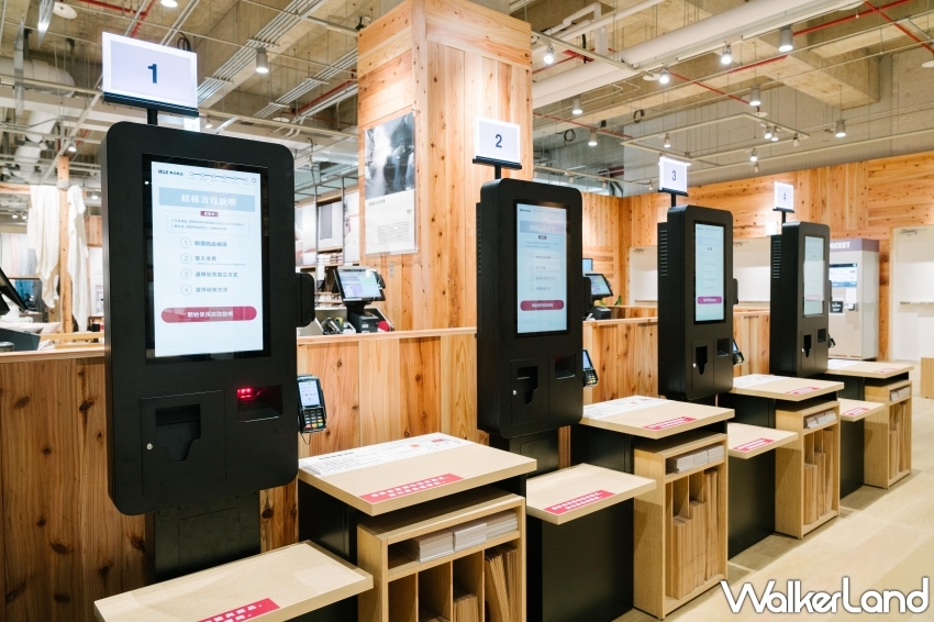 ▲▼MUJI無印良品 MITSUI OUTLET PARK 林口門市提供「自助收銀」服務,顧客可直接帶商品至自助收銀區進行簡便的信用卡或行動支付操作 / WalkerLand窩客島整理提供