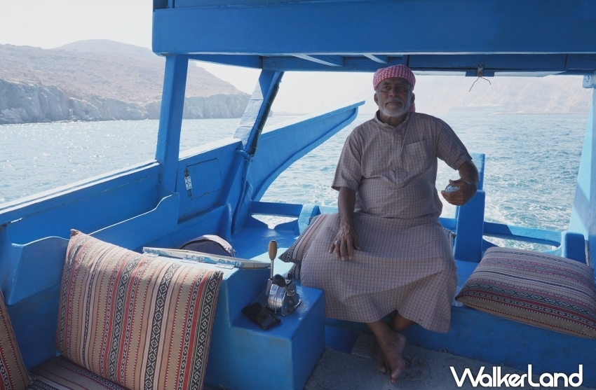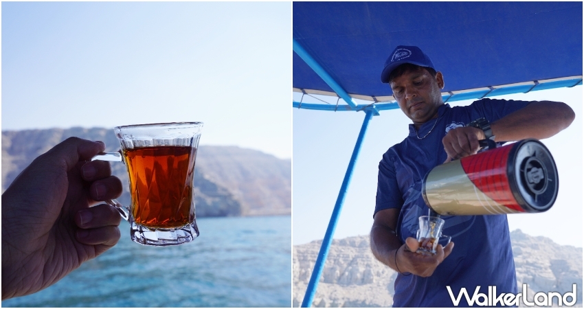 「傳統帆船峽灣巡遊」由經驗豐富的老船長掌舵,帶領大家深入阿拉伯海灣追尋海豚身影、前往秘境浮潛,而船上也有兩名船員分別負責沿途導覽解說,以及茶飲餐點服務;值得一提的是,這裡傳統帆船打破大眾對於遊船衛生清潔欠佳的刻板印象,乾淨又舒適,不少遊客索性半倚在船頭臥榻、伴著徐徐海風休憩。