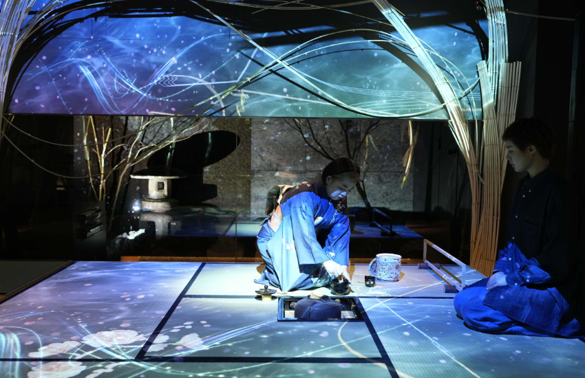 不僅提供美食與飲品,還能欣賞夢幻藝術展演。只要點購抹茶和菓子套餐或抹茶,就能進入名為「貴和」的光影茶室,親身體驗NAKED打造的夢幻光影藝術。整個空間巧妙地重現了京都東方的意象,彷彿置身於鴨川優美的自然景觀中,天花板上優雅的竹藝造型與光影交織,創造出令人嘆為觀止的視覺饗宴。此外,向天空延伸的竹藝術作品呈現流暢優美的曲線,傳統庭園景觀也是必看亮點。