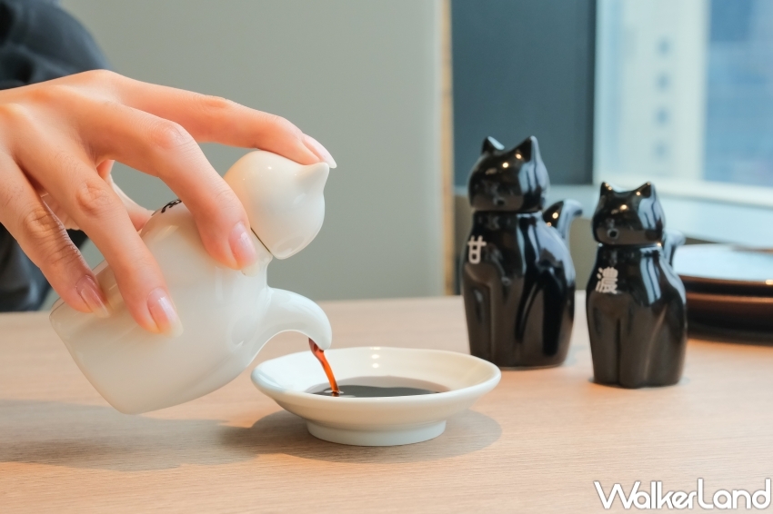 饗賓集團貓將壽司4月19日正式插旗遠百信義A13,貓將壽司分為板前座位、四人桌席與景觀席位區,還可以坐在大片玻璃前看101高樓邊吃壽司。特別的是,「貓將壽司」的品牌吉祥物就是一隻眼神超認真的料理貓,呼應日本經典的壽司大將,並且在整間店裡處處融入貓將的元素。除了門口有超大貓將打卡點之外,在醬油碟、茶杯都有可愛貓將,而醬料罐更是取名諧音「貓醬」,分為爽、甘、濃不同風味,並且以黑貓白貓作為造型罐,從貓咪的尾巴倒出醬油,直接萌翻粉絲。
