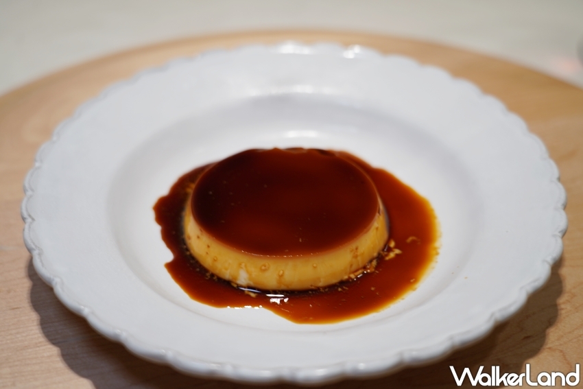 最後的甜點是廣受喜愛的焦糖布丁,不過「原始 蜂蛹卵」採用的雞蛋格外特別,源自蜂農以蜂蛹飼養的雞隻,並不對外販售。雞蛋體型較大,一顆雞蛋即可製作出一份布丁;主廚李祈睿表示,市面上的焦糖布丁多半偏重奶香,而「Li.nu 」追求的是蛋本身的黃金比例。因此,他僅以極少量的糖與牛奶製作,並「因蛋施教」,依據每顆雞蛋的大小精準微調配方。對比例如此精密拿捏,正是為了讓焦糖布丁回歸食材本質的起點。
