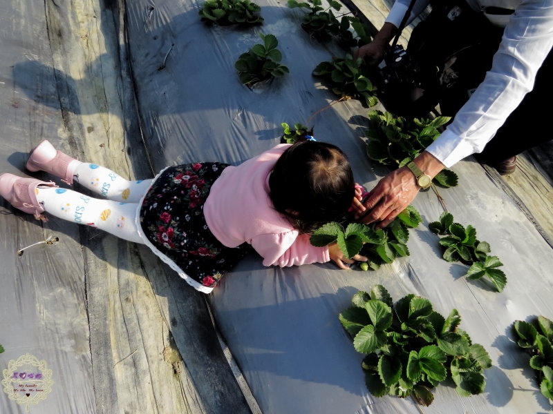 不管大人小孩都玩耍的超開心,一起學習怎麼採草莓!小密技:葉子下還有很多唷!