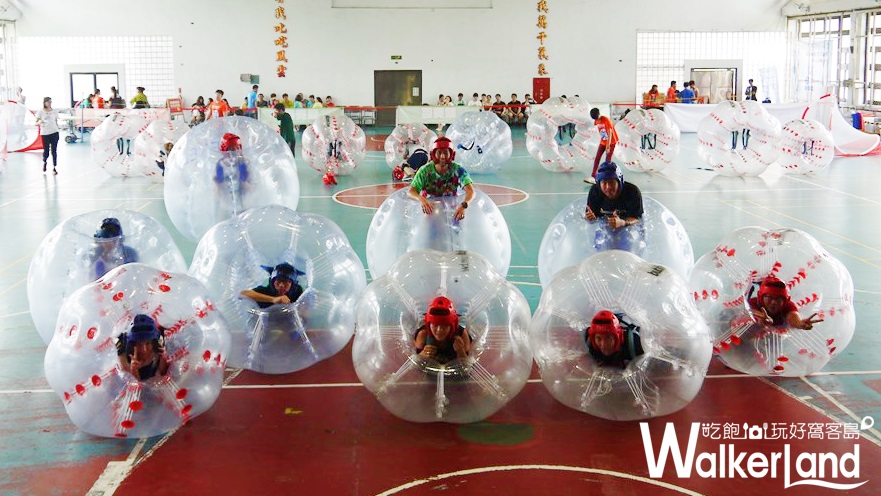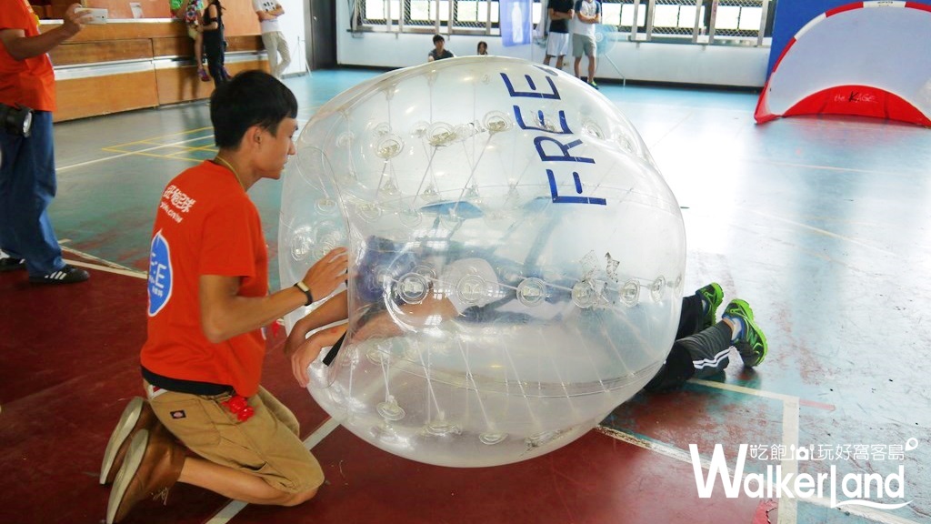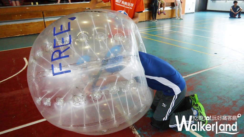 在開始碰撞PK之前,小編先來跟大家正式介紹瘋狂泡泡足球(bubble football),這項讓你下場體驗180度倒立腦充血的趣味競賽,其實源自於丹麥,參賽者穿戴安全護具後,將自己套進大氣球裡就開始進行競賽。參賽者分為兩隊,各有自己的球門,而將足球射入對方球門即可得分,獲得優勝。泡泡足球不是一項專業比賽而是男女皆宜的趣味競賽,適合6~10人的團體進行三三或五五趣味競賽(參加者必須為18歲以上),穿戴大氣球裡的參賽者,就算連滾帶摔,被撞飛得老遠也不擔心受傷(但小編強烈建議穿著短袖長褲,以及能夠保護腳踝的鞋具),這項趣味競賽目前風靡於歐洲、日本等地,近年也吹進台灣,你也正被賦予團體活動的重責大任嗎?除了大地遊戲之外,也可以來一起瘋狂泡泡足球唷!